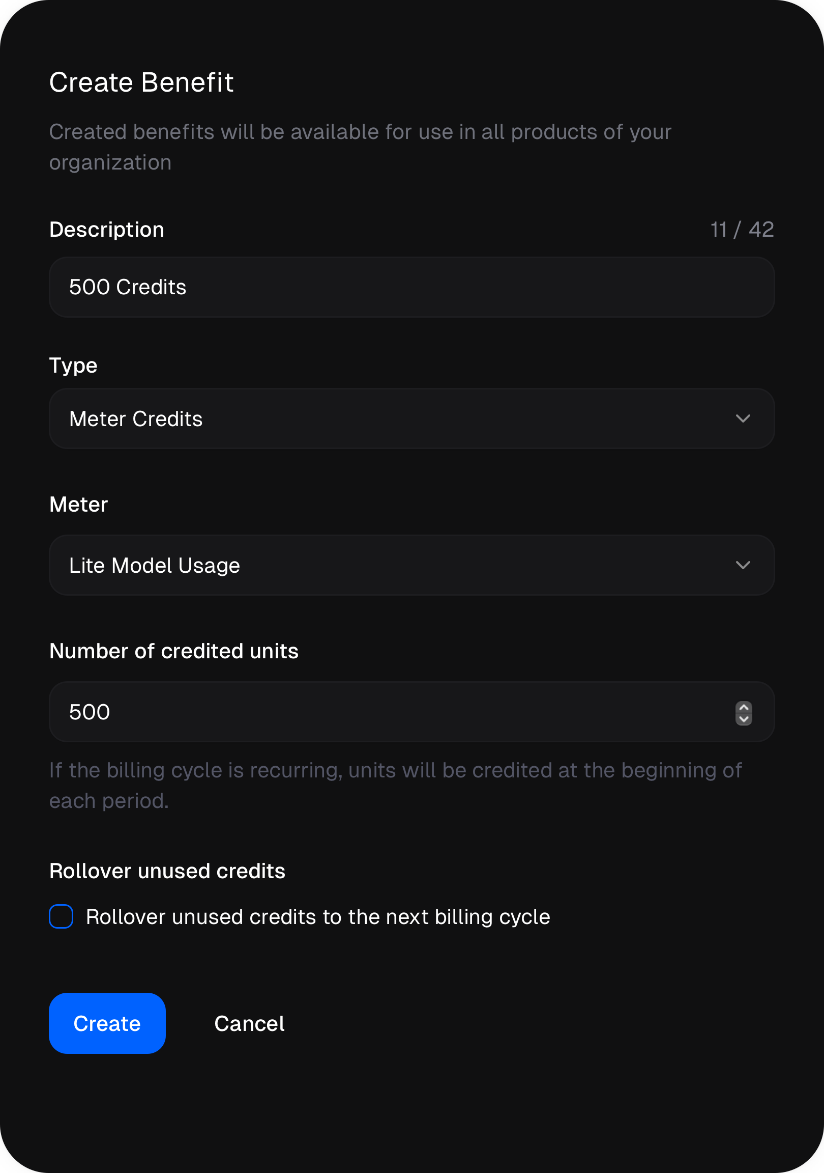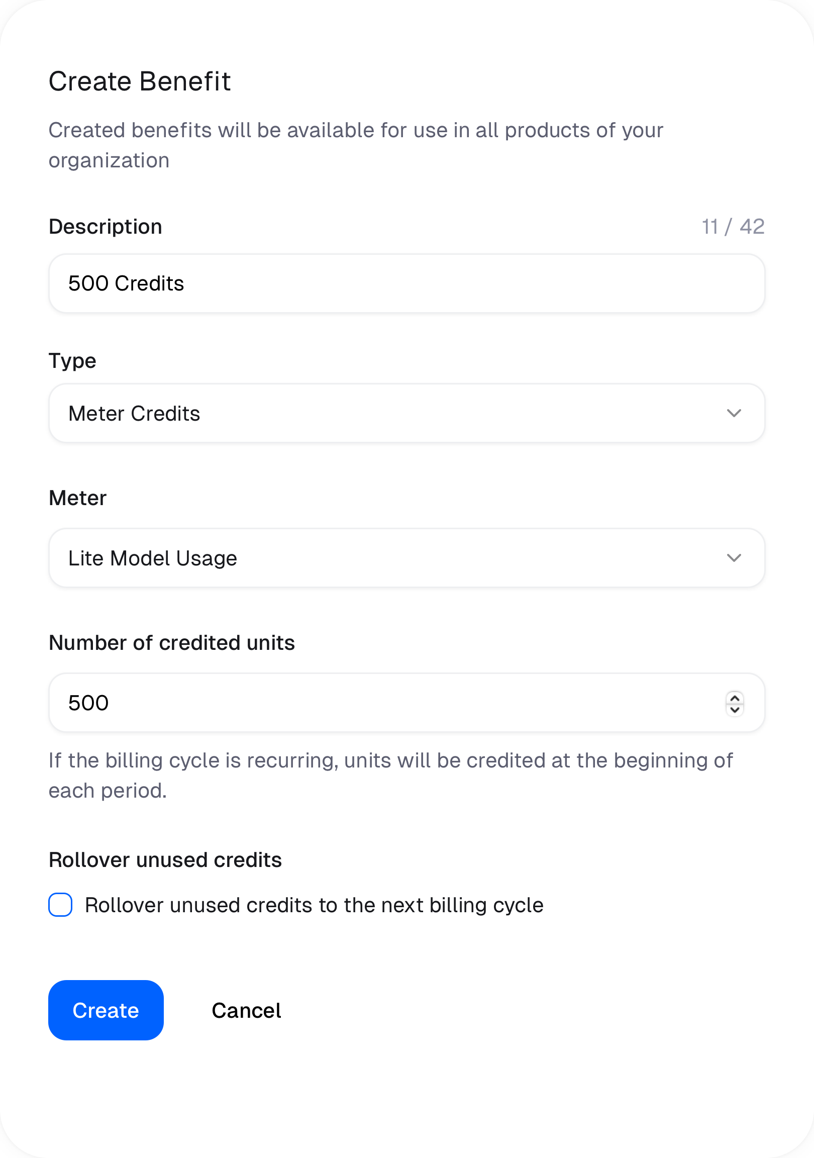 Você pode optar por transferir os créditos não utilizados para o próximo ciclo de cobrança. Isso significa que, se um cliente não usar todos os créditos em um determinado ciclo, os créditos restantes serão adicionados ao saldo do próximo ciclo. Para ativar esse recurso, marque a opção “Transferir créditos não utilizados” ao criar ou editar o benefício de Créditos.Se você alterar a configuração de transferência de um benefício, a mudança será aplicada apenas aos novos créditos emitidos após a alteração. Os créditos existentes não serão afetados.