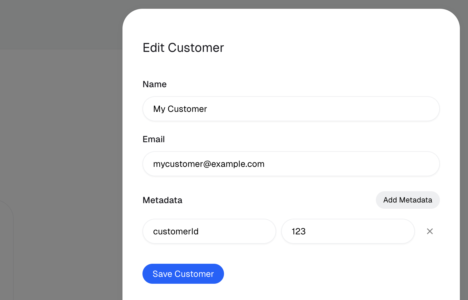 Você pode definir metadados adicionais para os Clientes. Isso pode ser extremamente útil para armazenar informações extras sobre seus clientes que você deseja disponibilizar por meio de nossa API e webhooks.